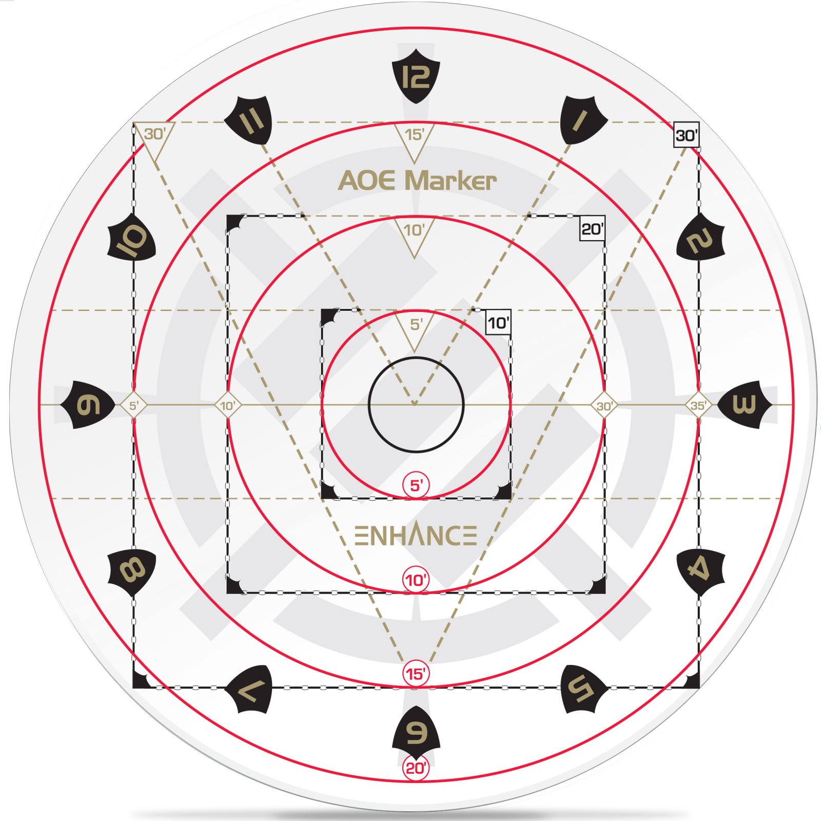 • 12 Marcatori pentru Directii Aleatoare: Pozitioneaza Sablon-ul pentru vraji AoE deasupra personajului si da cu un zar d12 pentru a determina aleatoriu in ce directie se poate misca personajul folosind marcatorii de „dispersie” (scuturile numerotate de la 1 la 12).