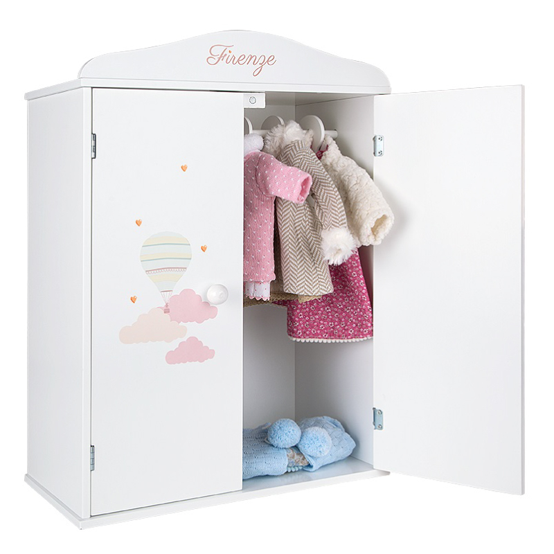 Dulapul Arias face parte din colectia Firenze si este fabricat din lemn. In dulapul Arias cei mici vor putea depozita toate tinutele si accesoriile papusilor lor. In plus, va arata grozav in camera lor, datorita designului sau foarte elegant. Dulapul Arias a fost realizat cu materiale de inalta calitate care garanteaza o durata lunga de viata a produsului. Include, de asemenea, un set de cinci umerase pentru a atarna hainutele papusilor.
