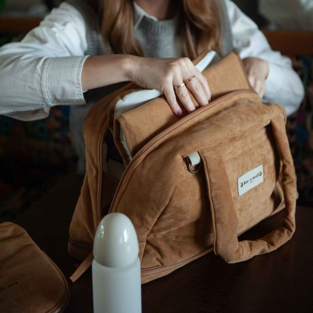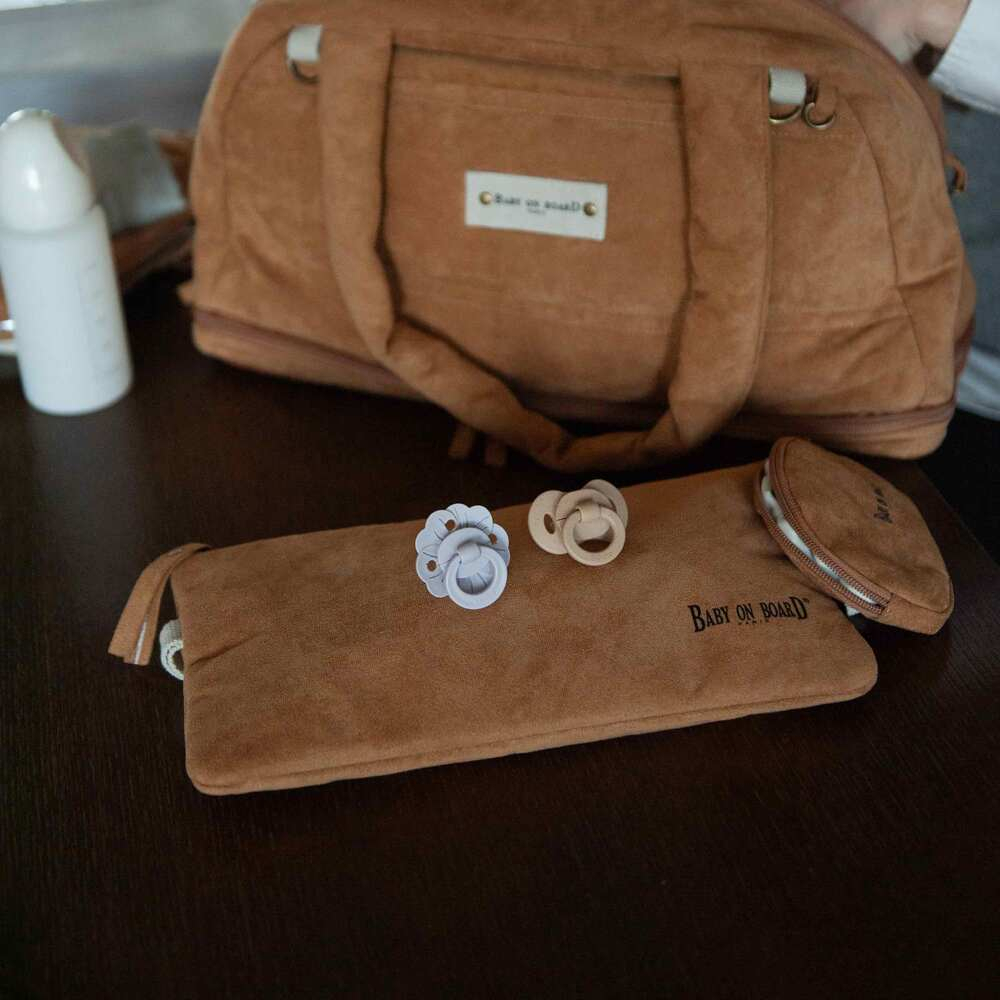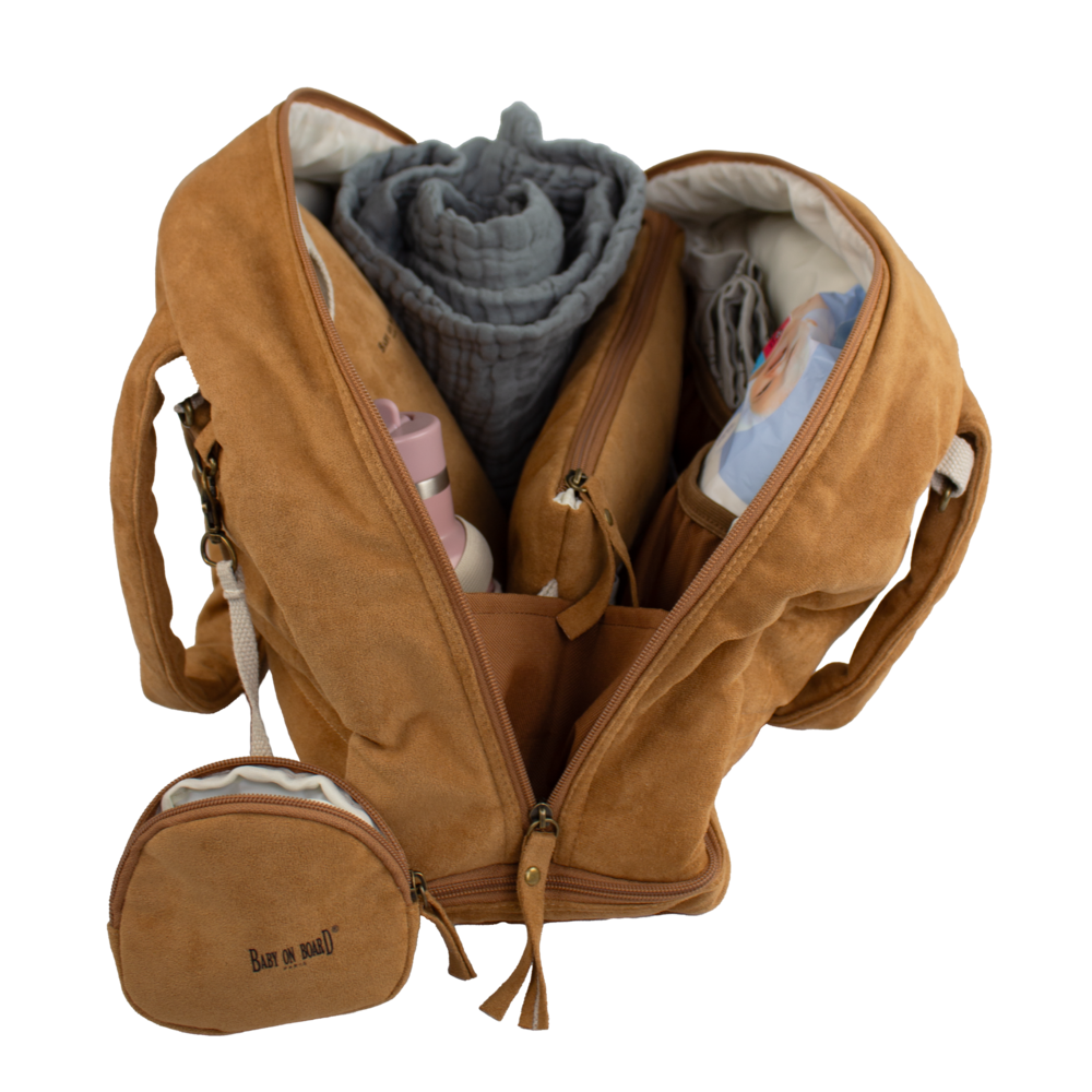 Geanta de infasat Baby On Board Doudoune Camel vine cu salteluta pliabila de schimb si pouch impermeabil pentru haine umede, toate asortate nuantei Camel.