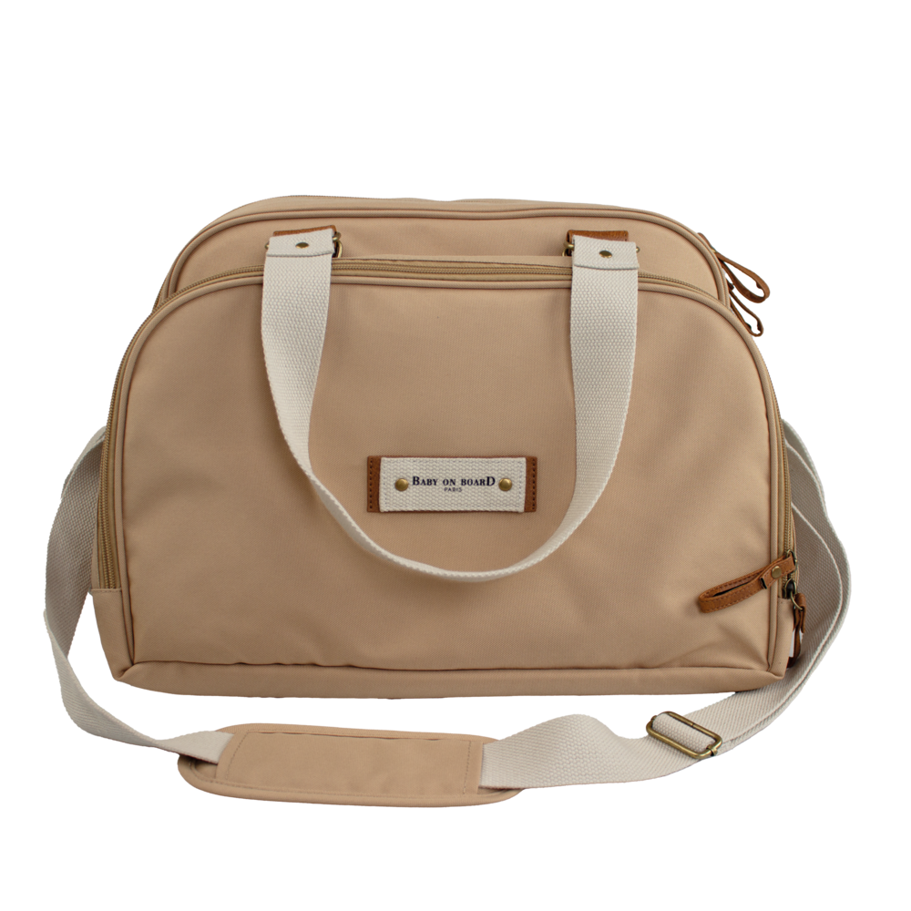 Salteluta pliabila, carabiniere stroller si punga pentru haine umede fac parte din kit. Rucsac bebelusi Baby On Board Urban Miel pastreaza cromatica prin detalii bej si fermoare metalice aurii.