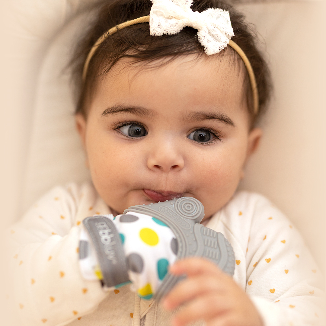 Manusa pentru dentitie bblüv Glüv Grey ofera alinare imediata si joaca distractiva, transformand eruptia dentara intr-o experienta mai putin stresanta.