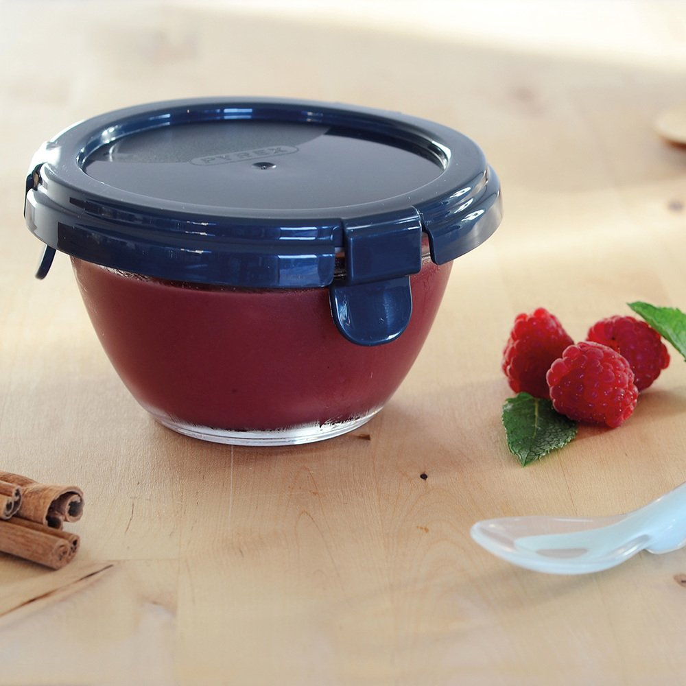 Recipientul pentru hrana are un volum de 200 ml, este fabricat din sticla borosilicata, care se caracterizeaza prin rezistenta chimica si termica. Recipientul rotund cu capac etans este rezistent la zgarieturi, nu se pateaza de la alimente si dupa spalare nu pastreaza mirosurile. Capacul asigura o mai buna protectie a alimentelor si este potrivit si pentru calatorii datorita inchiderii sale sigure. Mancarea poate fi de asemenea pastrata in frigider sau congelator. Recipientul Pyrex se poate utiliza fara capac in cuptorul cu microunde sau cuptorul clasic. Poate fi spalat manual sau in masina de spalat vase.