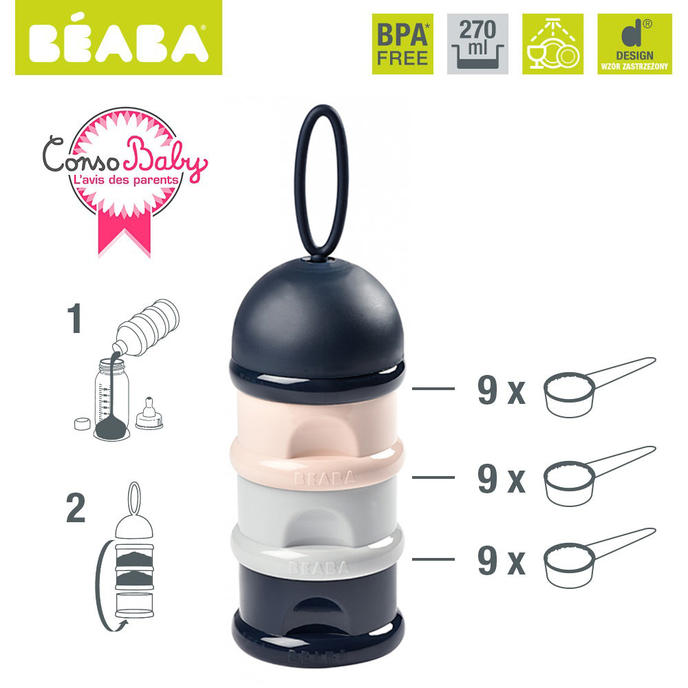 Cu recipientul de lapte praf Beaba puteti economisi timp, pregatindu-va in prealabil dozele de lapte. Este 100% etans, include 3 compartimente care contin pana la 9 doze fiecare. Cand copilul tau creste, poate fi folosi ca recipient pentru gustari.