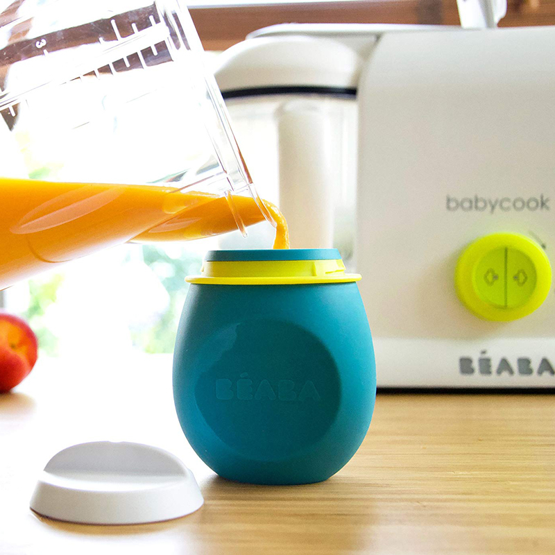 Recipient silicon Squeez Bleu recomandat pentru pastrarea mancarii bebelusului.