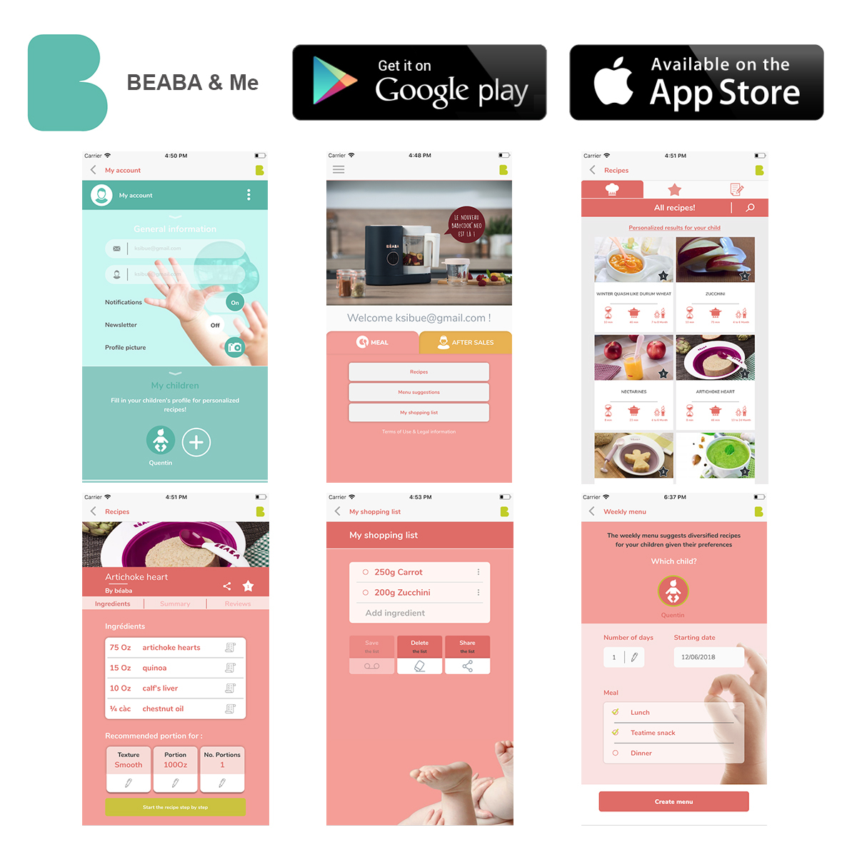 Babycook Néo, impreuna cu aplicatia Beaba&ME, ofera suport parintilor in pregatirea meniurilor personalizate. Aplicatie disponibila in App Store si Google Play.