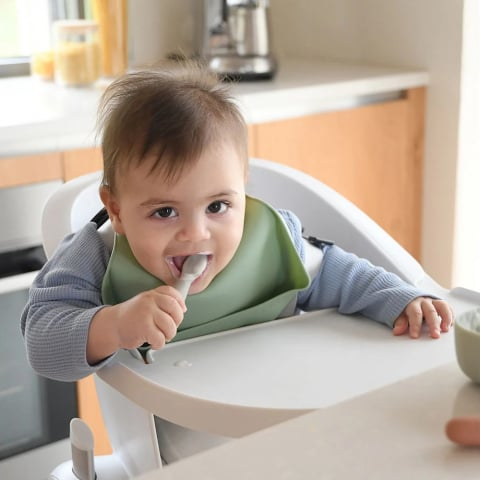 Set 2 linguri silicon Beaba Sage Green/Velvet Grey, cu forma si dimensiuni proiectate ergonomic.