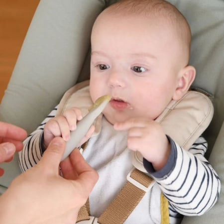 Set 2 linguri silicon Beaba Terracotta/Velvet Grey, cu forma si dimensiuni proiectate ergonomic.