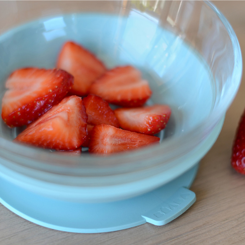 Setul este compus din farfurie, bol si pahar din sticla securizata, insotite de baze flexibile antiaderente. Concepute pentru a evita incidentele, bazele flexibile ale farfuriei si bolului au ventuze pentru a adera la masa sau la tavita scaunului de masa.