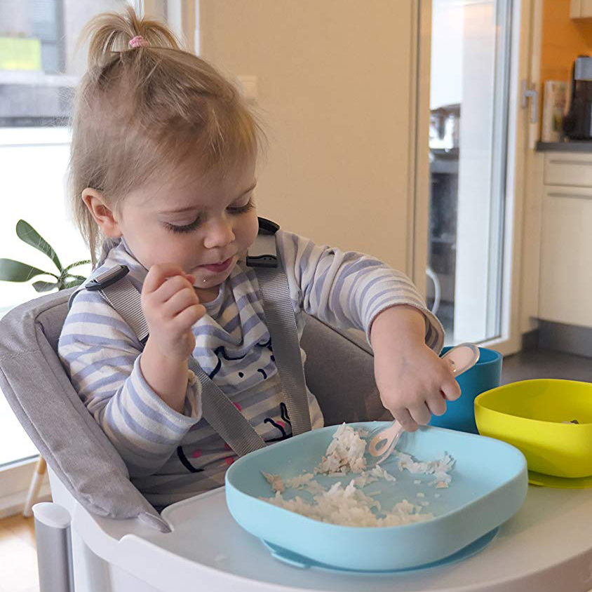 BEABA, brand francez si inventator al Babycook, ofera o gama completa de produse inteligente si bine gandite pentru mesele copiilor. Setul din silicon contine: pahar, bol, farfurie si lingurita. Produsele sunt special concepute pentru copiii care invata sa manance singuri, sunt ergonomice, cu colturi rotunjite si muchii drepte pentru a facilita apucarea alimentelor.