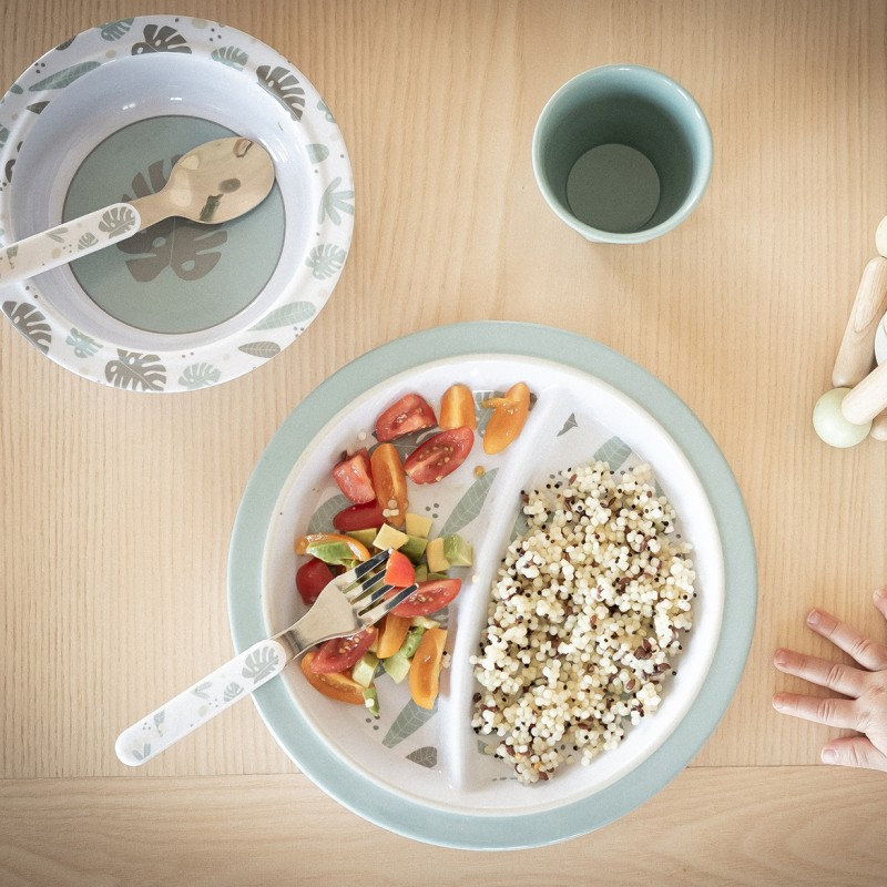 • Set compus din: farfurie cu 2 compartimente, bol, pahar si doua tacamuri.