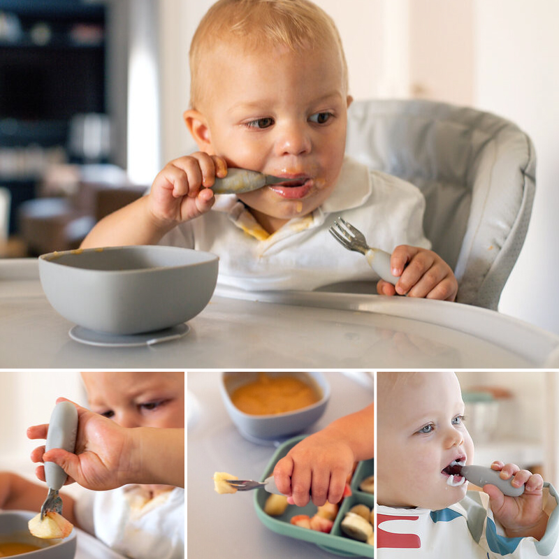 Set tacamuri inox Beaba Velvet Grey, cu forma si dimensiuni proiectate ergonomic.