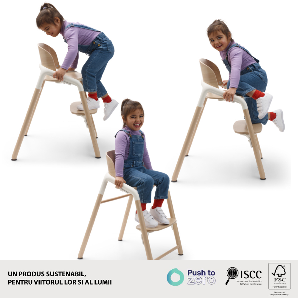 Scaunul Bugaboo Giraffe este realizat din lemn de fag european, certificat de Forest Stewardship Council pentru durabilitate. Toate piesele din plastic sunt construite din materiale pe baza biologica certificate ISCC, ceea ce inseamna ca amprenta de CO2 a lui Bugaboo Giraffe este cu 42% mai mica decat daca ar fi fost realizata folosind materiale plastice conventionale.