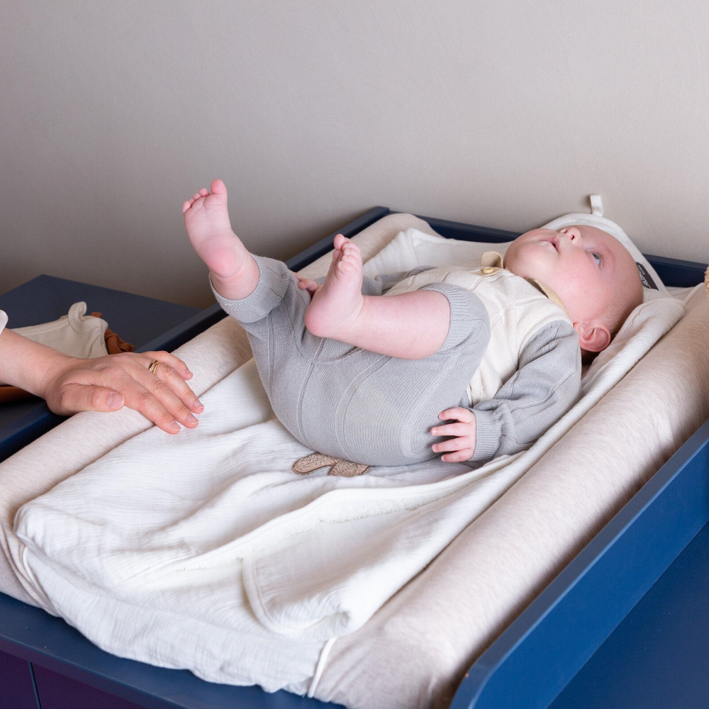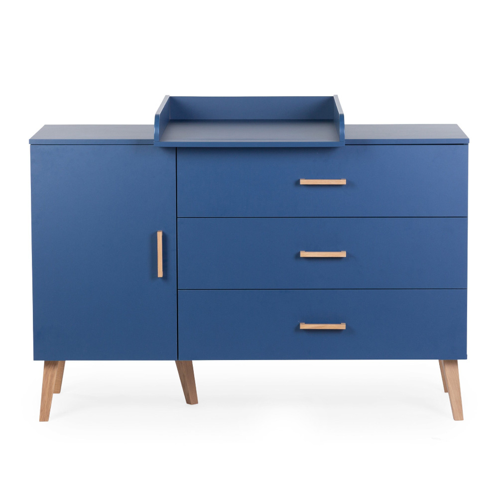 Comoda Childhome Bold Blue este compusa din 3 sertare, dulap cu 2 rafturi si masa de infasat detasabila. Echipata cu un sistem de inchidere silentios, nu vei trezi niciodata bebelusul inchizand un sertar.