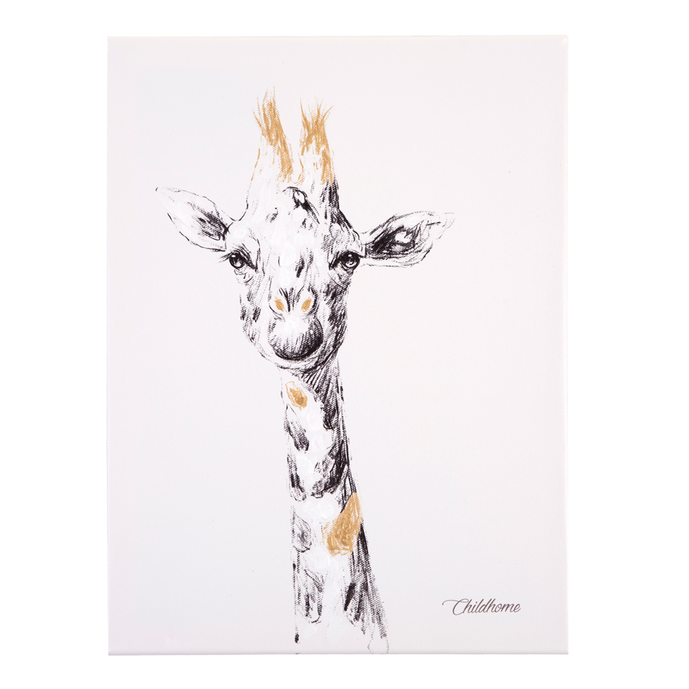 Tabloul Childhome in tonuri alb-negru, cu detalii aurii elegante, infatiseaza o Girafa draguta si este decorul perfect pentru o camera la moda.