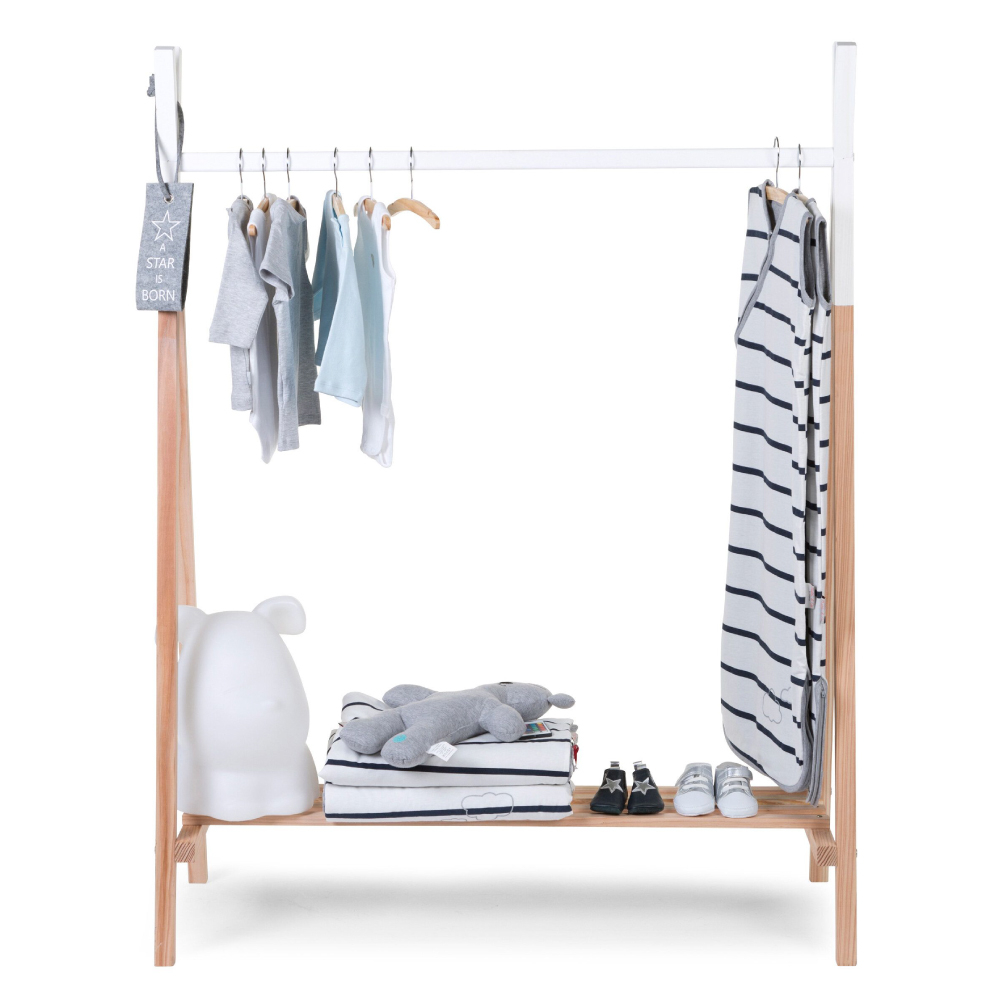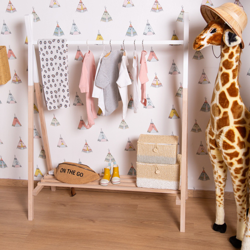 Suportul pentru haine Tipi Childhome include un raft in partea de jos si o bara pentru umerase in partea de sus.