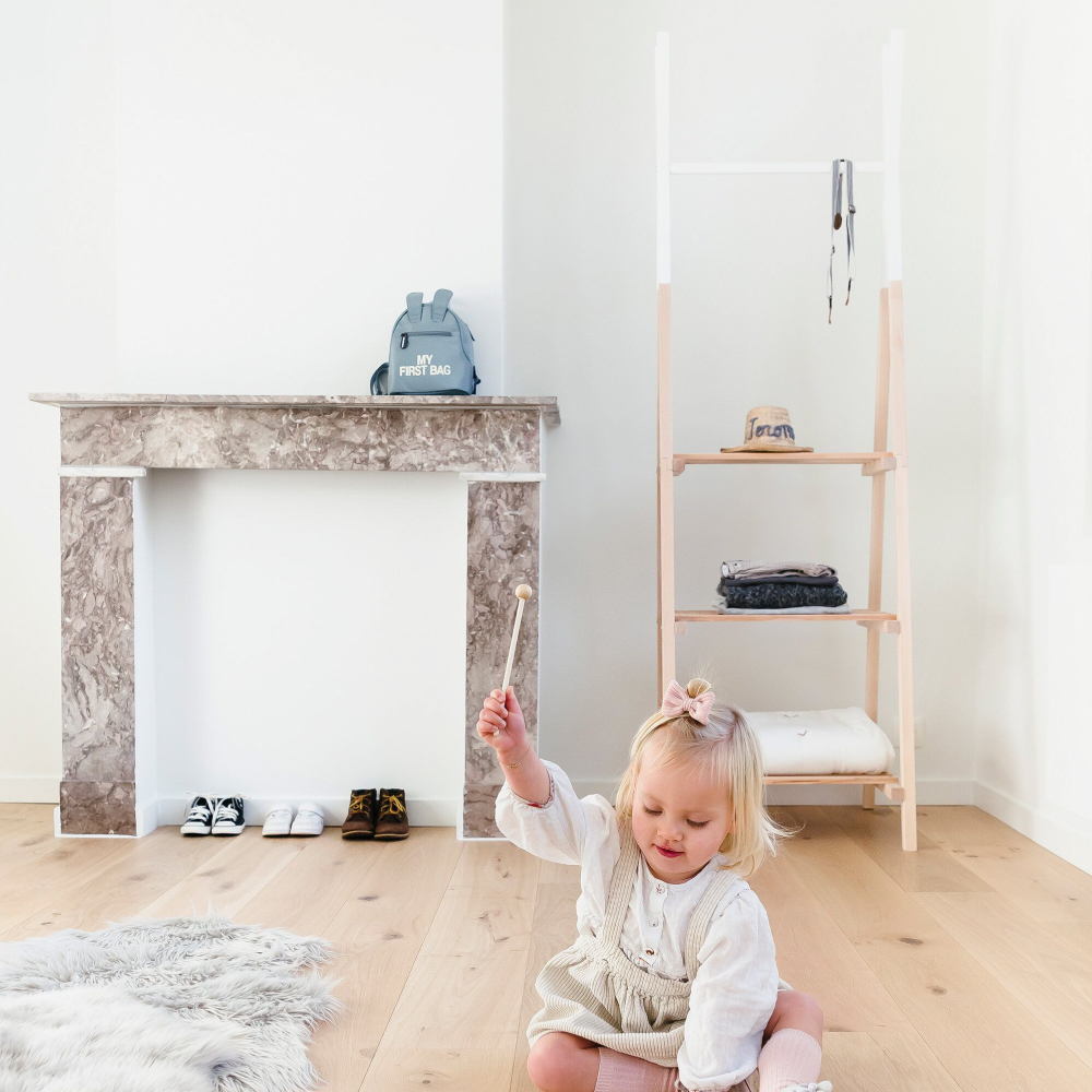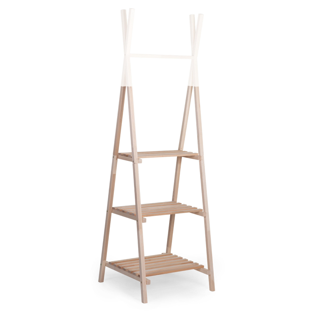 Suportul pentru haine Tipi Childhome include 3 rafturi si o bara pentru umerase in partea de sus.