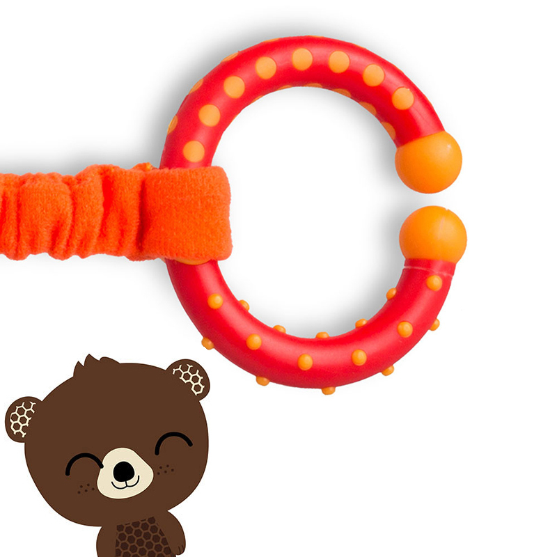 Protectiile moi sunt decorate cu animale din plus, iar jucaria vibranta multi-senzoriala capteaza atentia celui mic in timpul plimbarii. Agatatoarea tip inel a jucariei are rol senzitiv si de inel pentru dentitie.