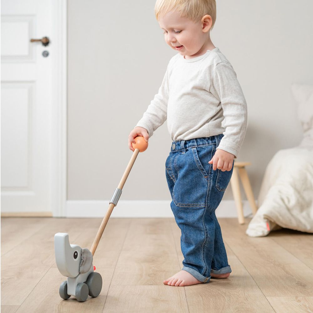 Jucarie Push Along Done by Deer din lemn Elphee Grey sustine echilibrul, coordonarea ochi-mana si motricitatea grosiera. Miscarile repetate si raspunsul vizual-auditiv sporesc atentia, rabdarea si increderea in propriile abilitati de mers.