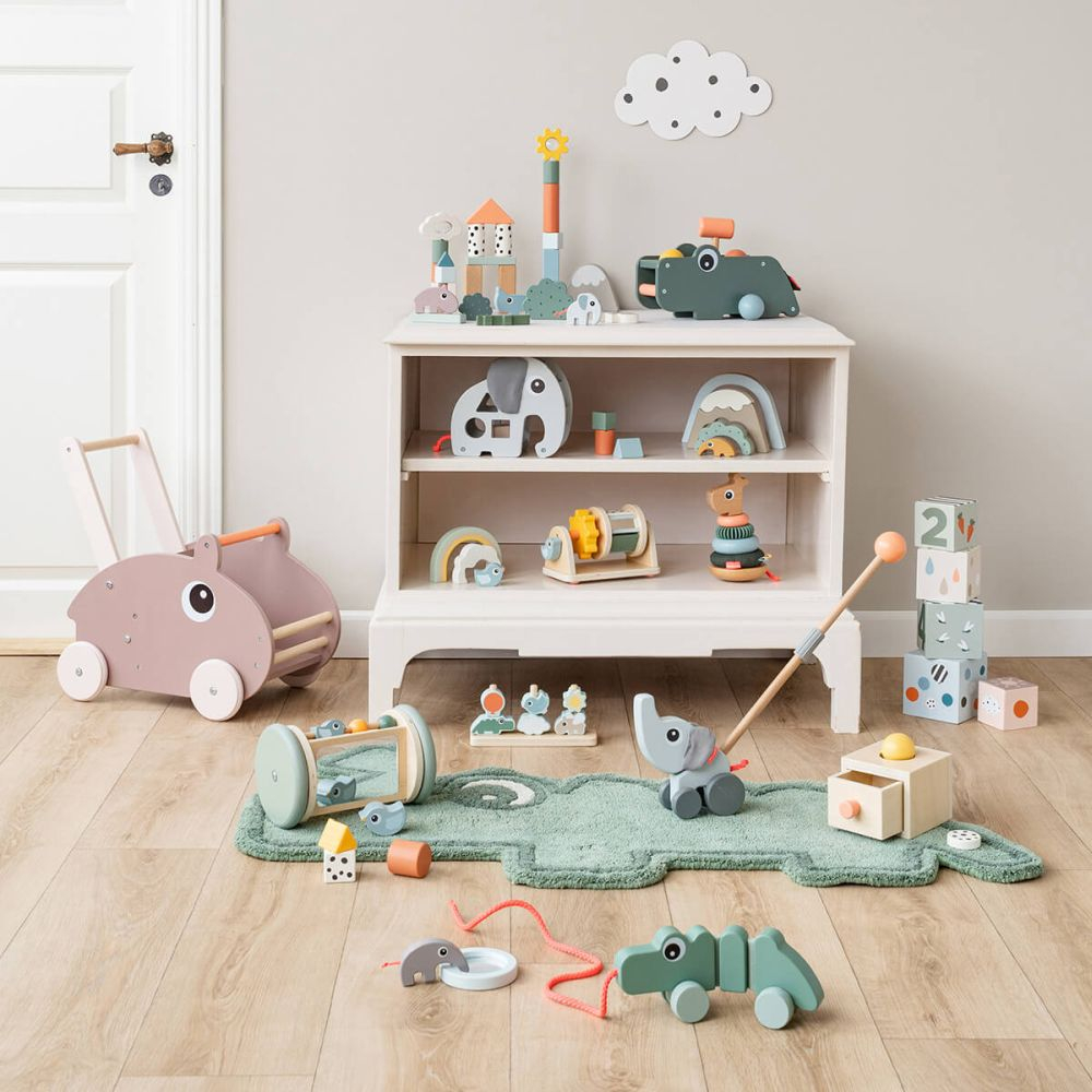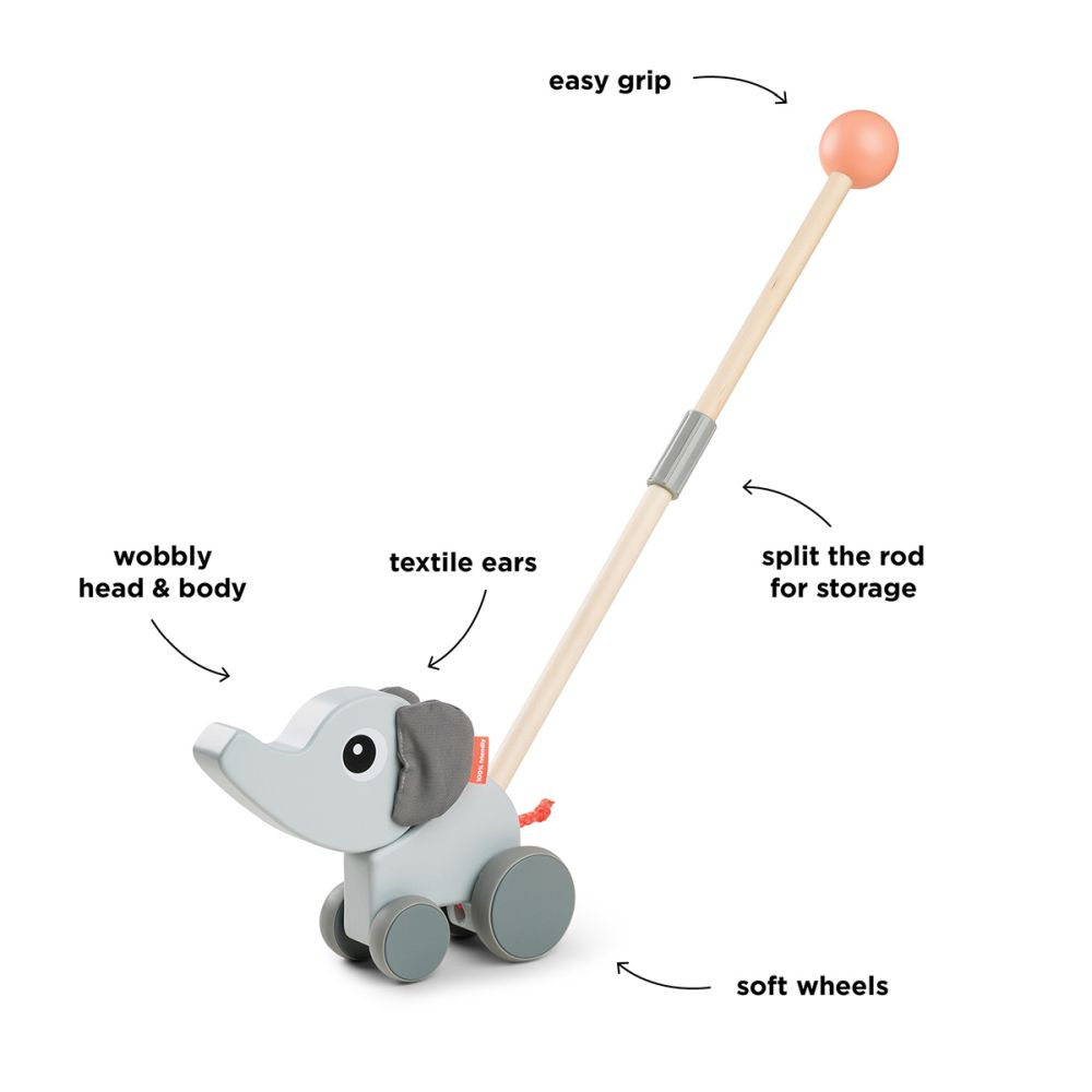 Fabricata din lemn de calitate si vopsita cu vopsele pe baza de apa, fara substante nocive. Jucarie Push Along Done by Deer din lemn Elphee Grey are roti moi pentru protectia pardoselilor si margini finisate pentru utilizare sigura.