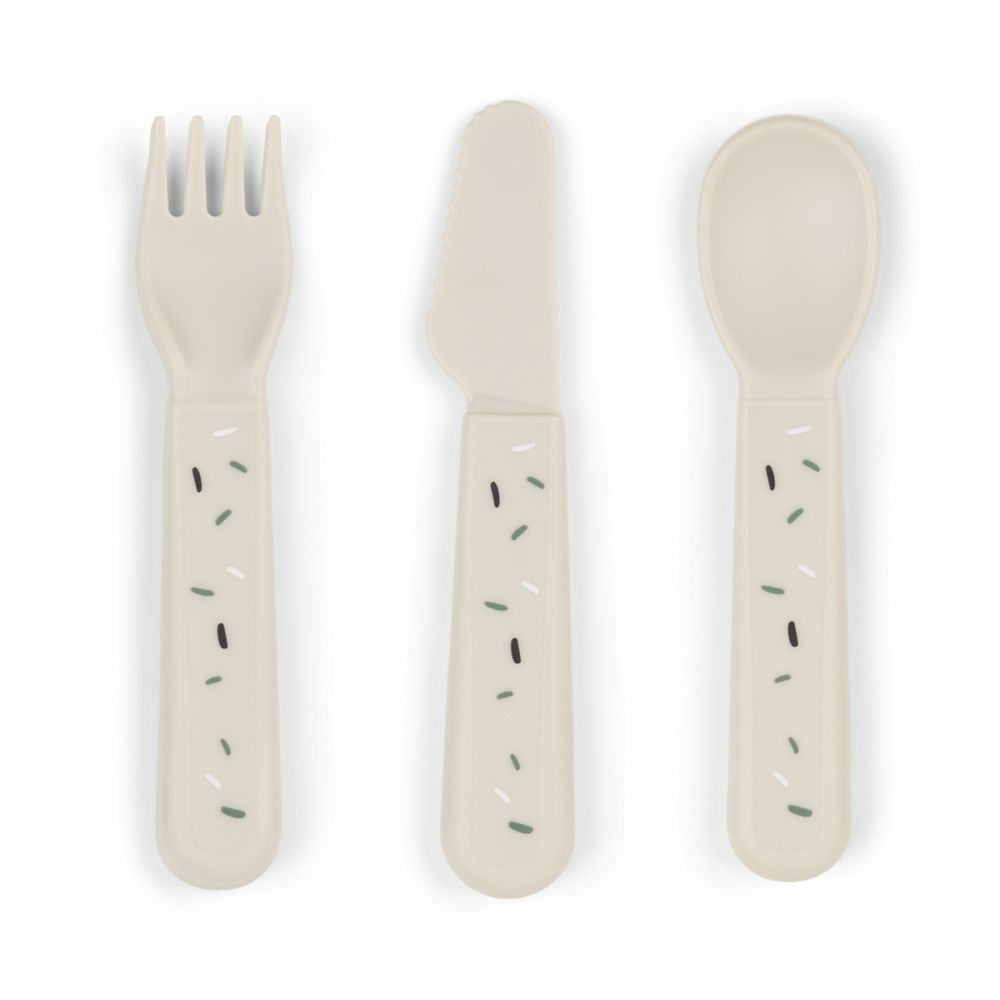 Daca vrei tacamuri confortabile, sigure si atragatoare, Set tacamuri Foodie Done by Deer Confetti Sand este alegerea potrivita pentru primele mese independente.