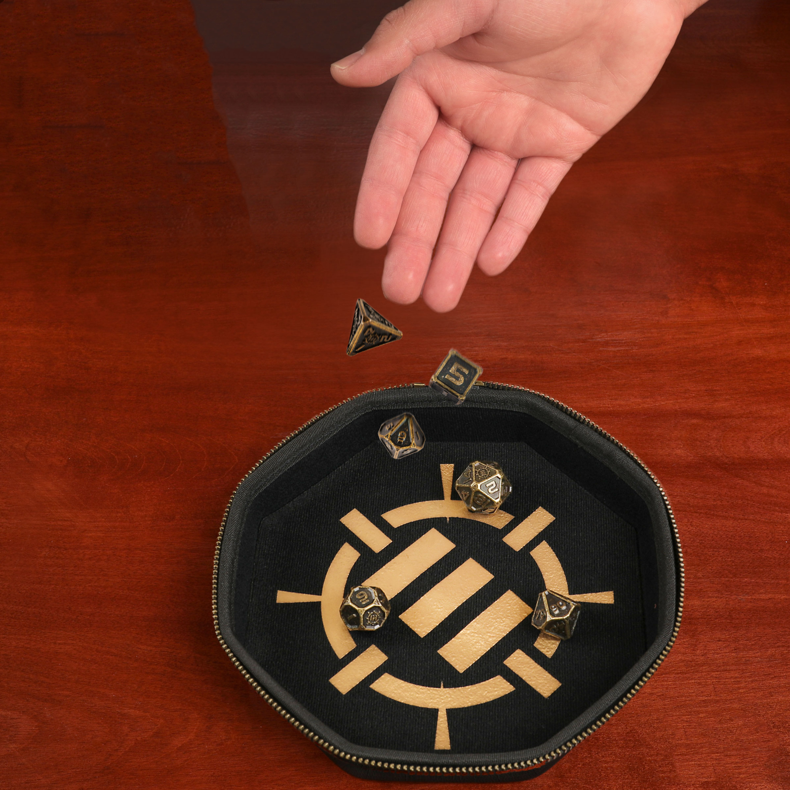 Zarurile sunt finisate cu un aspect de bronz uzat, creand o atmosfera autentica, perfecta pentru povestile tale fantasy. Fiecare zar poarta logo-ul ENHANCE pe cea mai mare valoare (ex. d20 are logo-ul in loc de numarul 20), adaugand un plus de stil fiecarei aruncari.