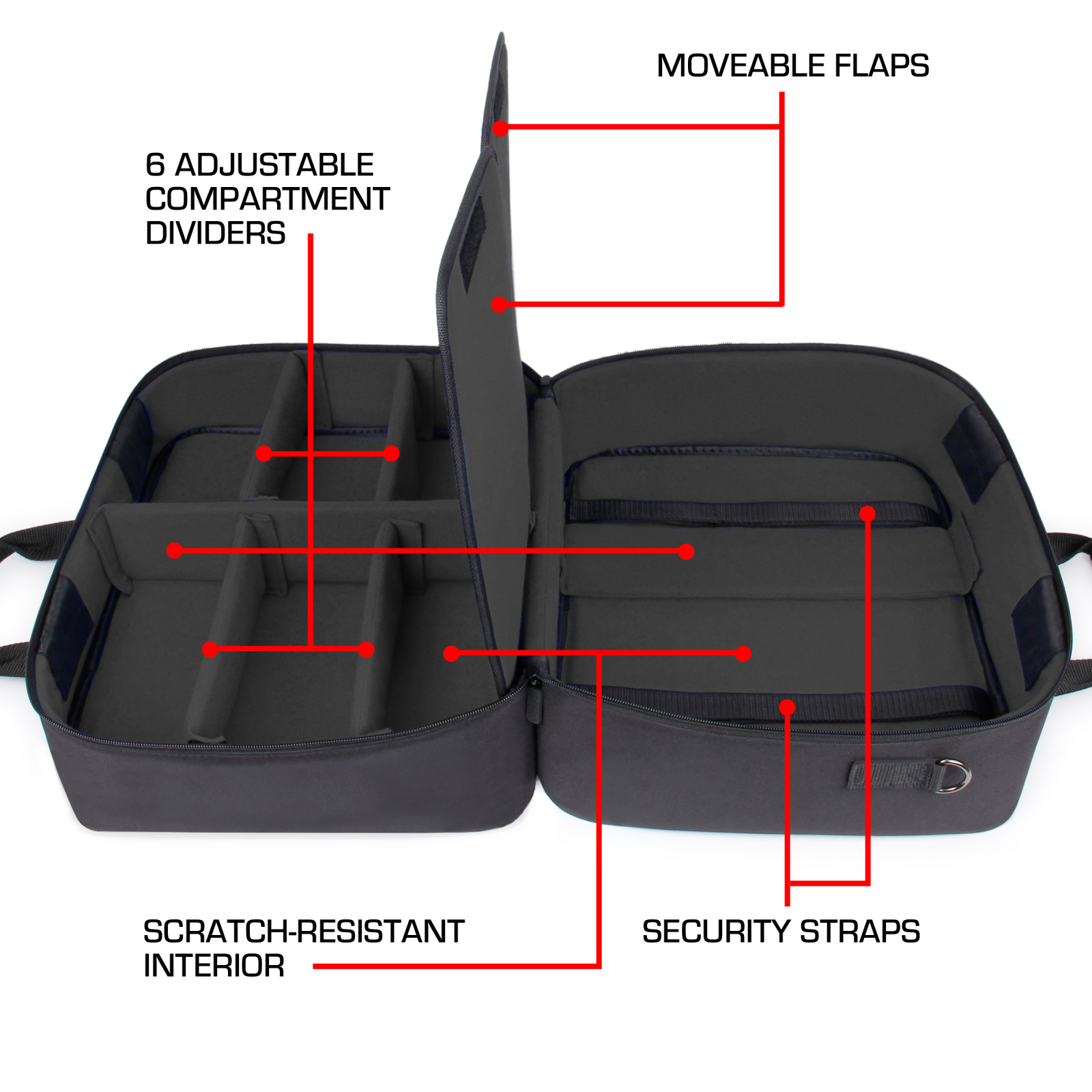 - INTERIOR CAPTUȘIT ȘI INTARIT - Interior premium rezistent la zgarieturi, echipat cu separatoare ajustabile intarite, care mentin cartile si cutiile pentru deck-uri in siguranta pe durata transportului.