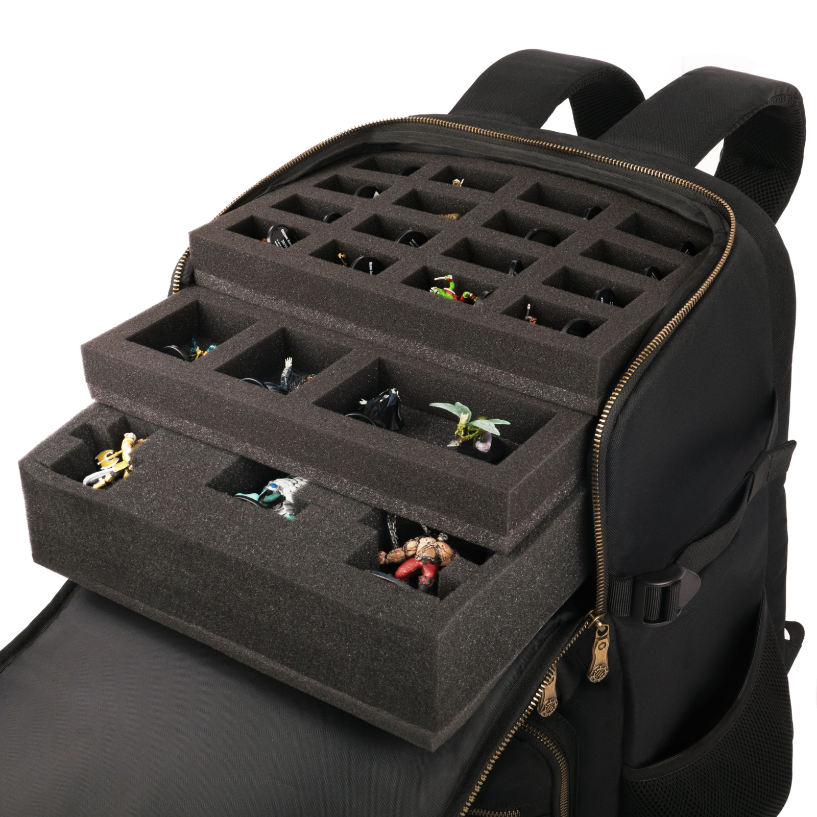Compartimentul cu fermoar situat in partea superioara a rucsacului include 3 tavi din spuma integrate pentru miniaturi: