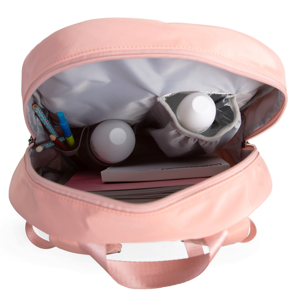 Compartimentul principal contine 2 spatii (unul potrivit pentru o tableta), 2 benzi elastice si un buzunar izolator pentru o sticla de baut. Este prevazut un buzunar frontal, curelele de umar cu suprafata din plasa permit o ventilatie suplimentara. Brelocul reflector ofera o vizibilitate mai buna in intuneric. Ghiozdanul Childhome ABC este un rucsac complet si combina designul frumos cu usurinta enorma in utilizare.
