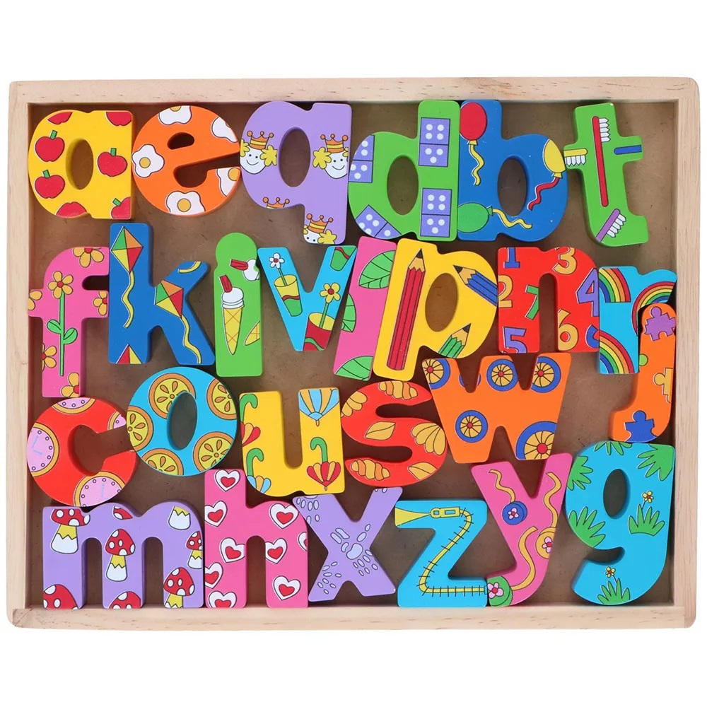 Setul include 26 de litere mici din lemn in diverse culori, decorate cu desene vesele. Desenele corespund literelor, deoarece cuvintele in limba engleza incep cu litera corespunzatoare.