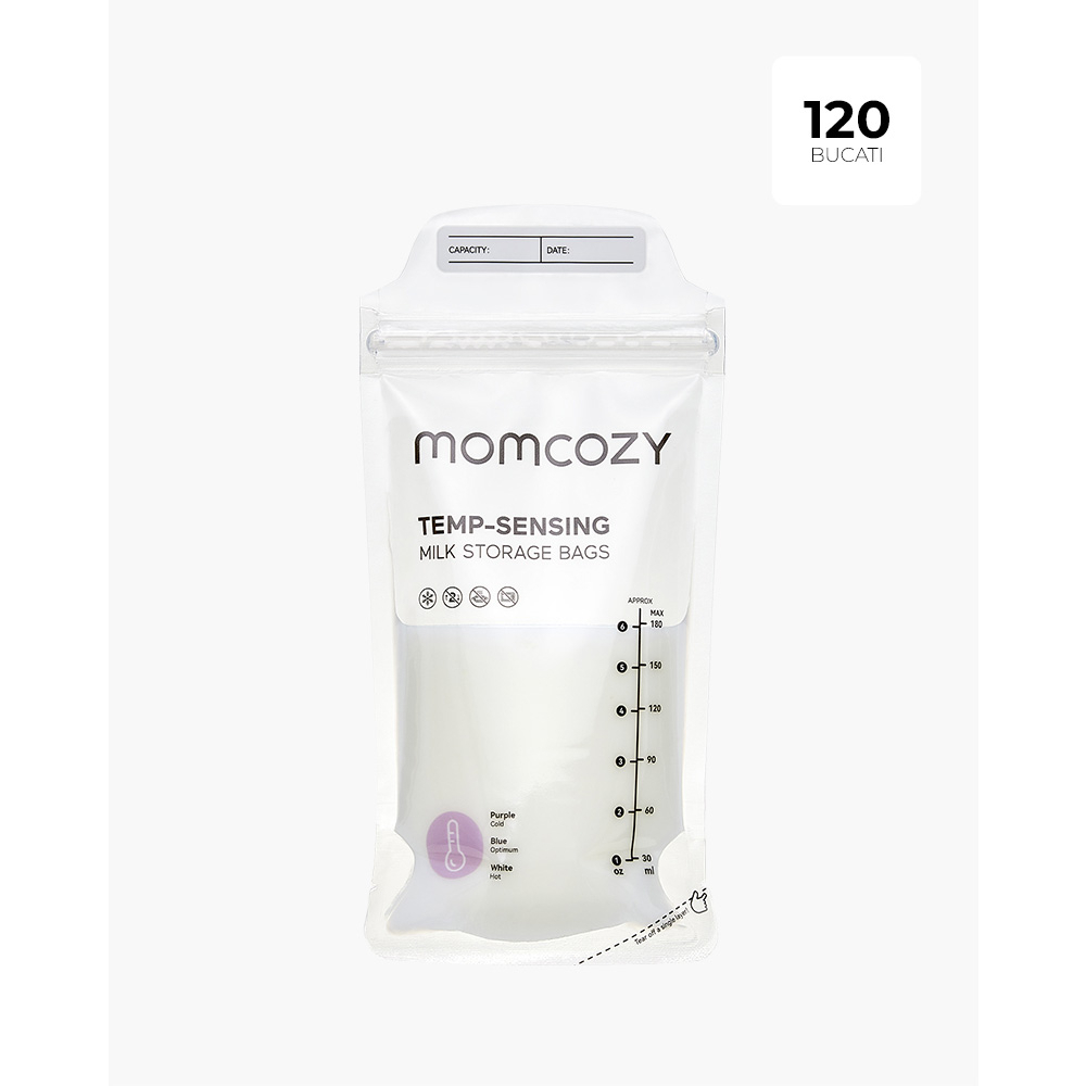 Pungi depozitare lapte Momcozy 120 buc sunt potrivite pentru frigider si congelator, cu un profil subtire care optimizeaza spatiul. Stivuirea plana te ajuta sa gestionezi mai usor rezervele si sa aplici principiul FIFO (first in, first out) pentru a folosi mai intai portiile mai vechi. La decongelare, aseaza punga in frigider peste noapte sau in apa rece, apoi incalzeste treptat in apa calda, fara a depasi temperatura recomandata pentru hranire.
