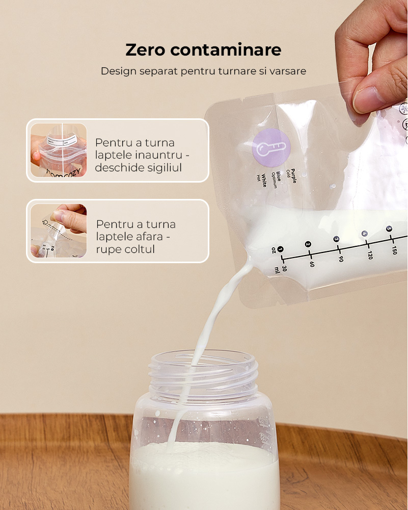 Deschide punga la nivelul zip-ului, fixeaz-o vertical si toarna cu grija laptele colectat. Elimina excesul de aer inainte de inchidere, apoi sigileaza prin presare ferma pe toata lungimea zip-ului. Pentru congelare, aseaza punga in pozitie plata pentru a accelera decongelarea ulterioara. Nu incalzi direct pe flacara, in cuptor sau in cuptor cu microunde. Verifica intotdeauna temperatura continutului inainte de hranire.