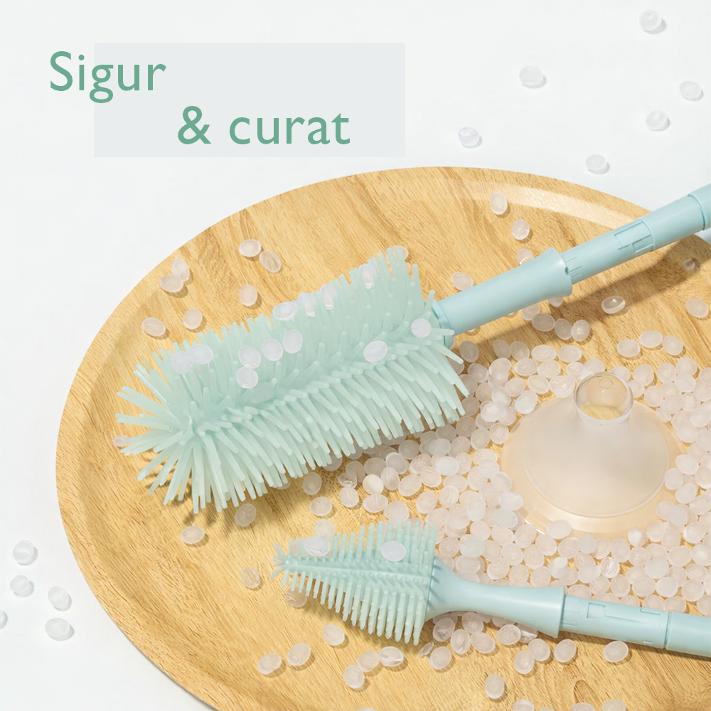Setul de curatare biberoane Momcozy cu spuma 360 Push-Press Green este dotat cu un sistem Push-Press inteligent, care permite eliberarea controlata a detergentului direct in perie. Capul cu spuma 360 asigura curatarea uniforma a intregii suprafete interioare a biberoanelor, inclusiv in zonele greu accesibile.
