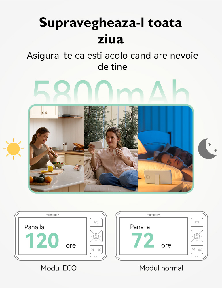 Video monitor Momcozy BM03 5.5 inch are baterie de 5800 mAh, iar in modurile VOX si ECO poate sta in standby pana la 5 zile (in functie de utilizare). Interfata este conceputa pentru operare intuitiva, cu setari rapide pentru volum, moduri si ecran.