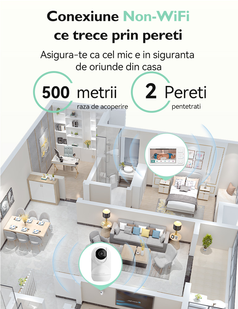 Daca vrei un monitor fara Wi-Fi, cu ecran mare si control complet din unitatea parentala, Video monitor Momcozy BM03 5.5 inch combina imagine 1080P, pan/tilt, moduri VOX/ECO si stocare locala. Video monitor Momcozy BM03 5.5 inch este potrivit pentru supraveghere in casa si poate creste odata cu nevoile familiei, prin posibilitatea de a adauga camere.