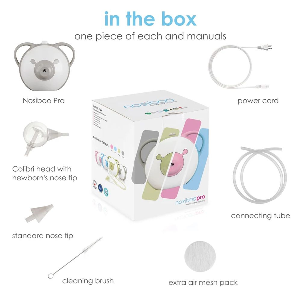 Aspiratorul nazal electric Nosiboo Pro este un dispozitiv medical care respecta cerintele FDA. Este alimentat electric pentru a produce o putere de aspiratie suficienta, dar ajustabila, iar solutia sa inovatoare este blanda si sigura pentru copii. Datorita capului din material plastic brevetat, fara BPA si a varfului din silicon, dispozitivul nu irita membrana mucoasa nazala. Nu numai ca asigura curatarea eficienta a nasului, ci se adapteaza perfect la nevoile bebelusului.