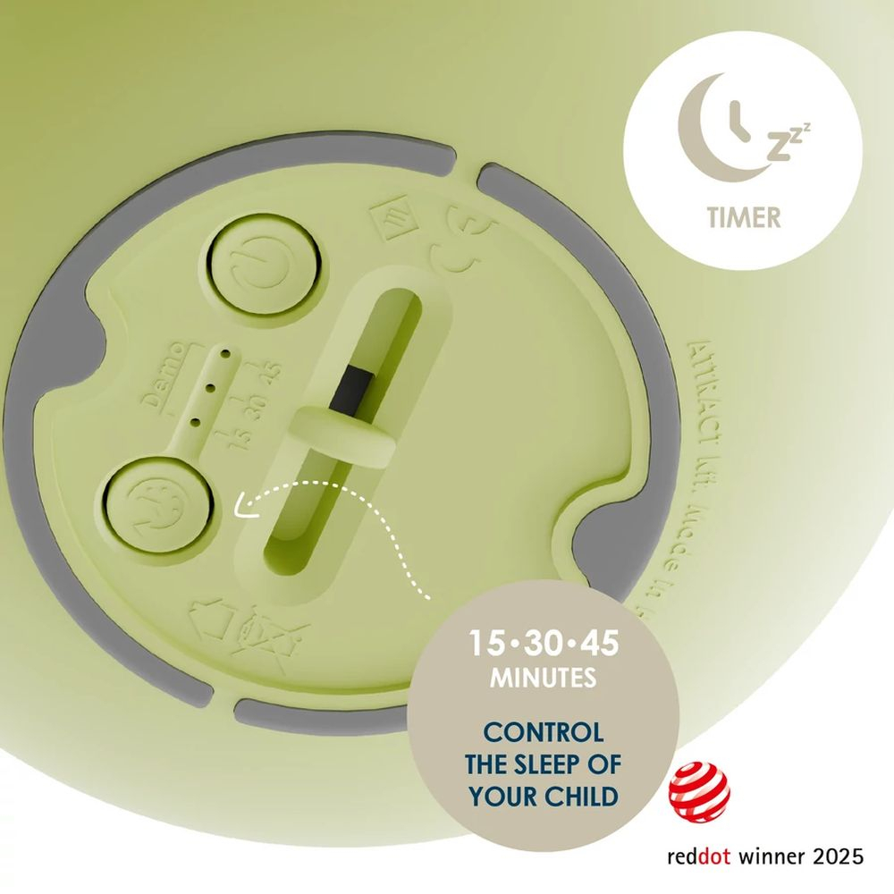 Lampa de veghe Nosiboo Zigg antrenor de somn pentru copii cu lumina rosie si temporizator Sage are temporizator integrat cu intervale de 15 / 30 / 45 de minute. In acest timp, lumina se diminueaza treptat, iar „aripa” (capacul) se inchide incet, ca parte din ritualul de adormire. In plus, un senzor detecteaza lumina diminetii si comuta automat in mod de asteptare, pentru utilizare mai simpla de la o zi la alta.