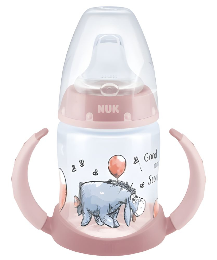 Daca iti doresti un biberon de tranzitie, cu manere usor de tinut, cioc moale din silicon si verificare vizuala a temperaturii, Biberon Nuk First Choice PP 150 ml, Control Temperatura, Tetina Invatare Silicon 6-18 luni, Disney Roz este o alegere practica. Combina controlul temperaturii, confortul la baut si un design Disney Roz care poate face rutina mai placuta.