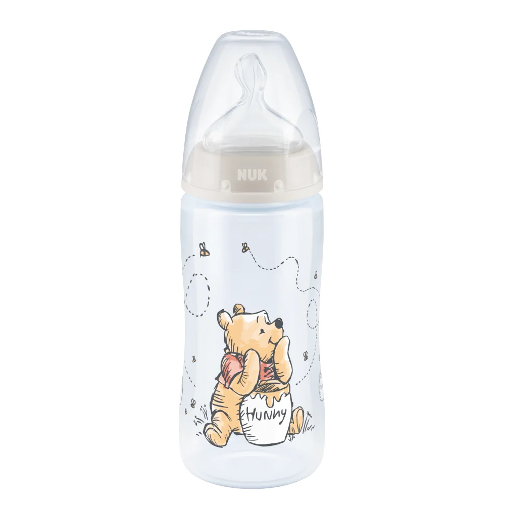 Biberon Nuk First Choice PP 300 ml Control Temperatura Tetina Silicon M 0-6 luni Disney Winnie Gri – pentru hranire sigura si relaxata.