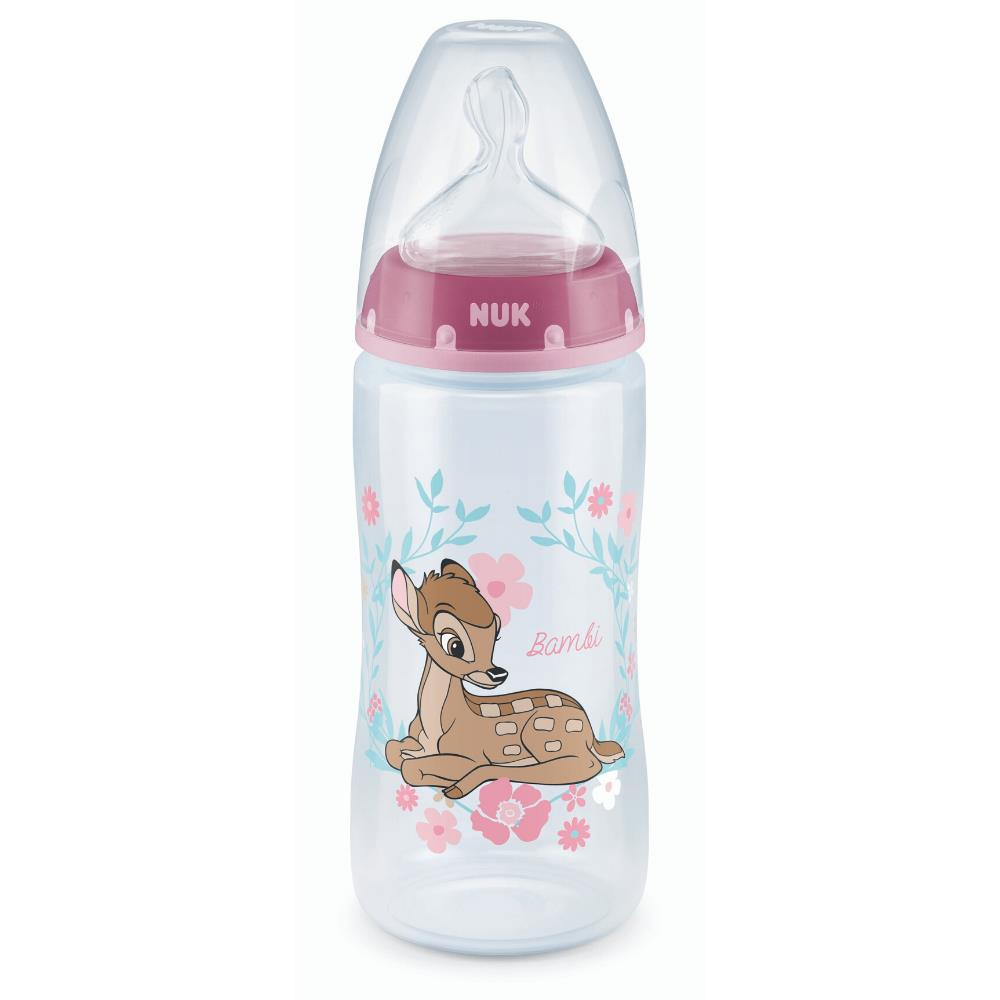 Biberon Nuk First Choice cu design Disney Bambi, 300ml, tetina din silicon perfecta pentru maxilar, varsta 6-18 luni, fabricat din polipropilena, fara BPA.