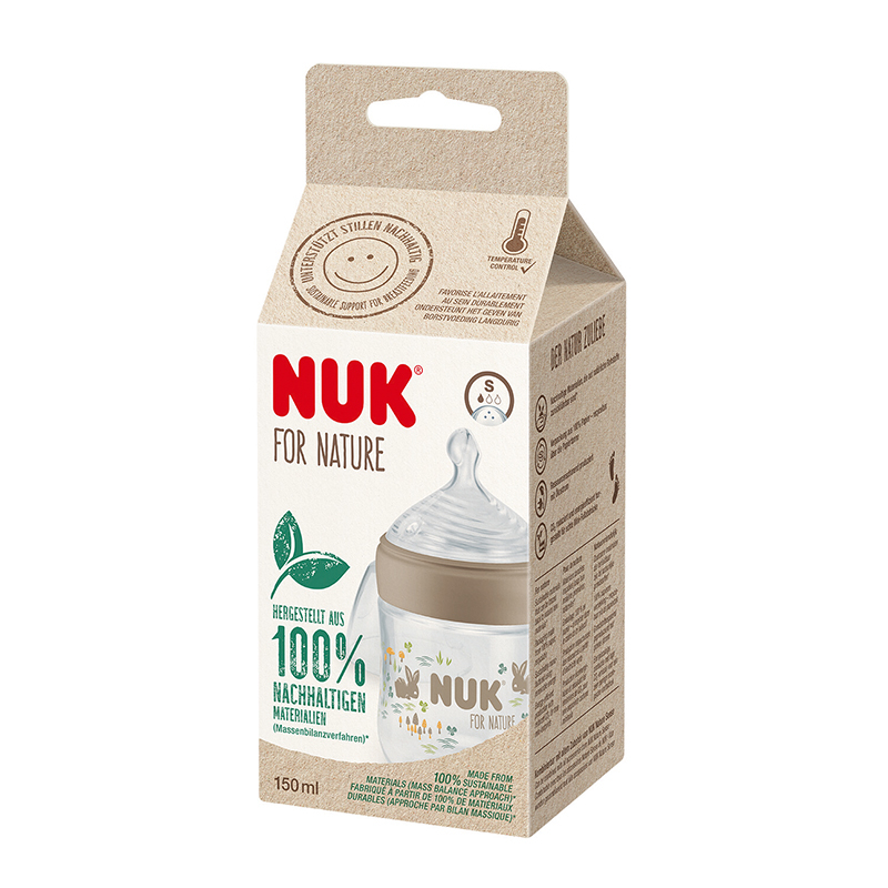 Biberonul Nuk for Nature este realizat din 100% materiale sustenabile (conform abordarii bilantului de masa). Tetina moale este realizata din silicon sustenabil si restul partilor componente din plastic sustenabil. Toate articolele Nuk for Nature sunt ambalate in 100% hartie certificata FSC, ce poate fi aruncata in cosul pentru reciclarea hartiei. Si pentru a reduce amprenta de carbon, folosim energie verde pentru a fi prietenosi cu mediul: de la materii prime si pe tot parcursul de fabricatie.