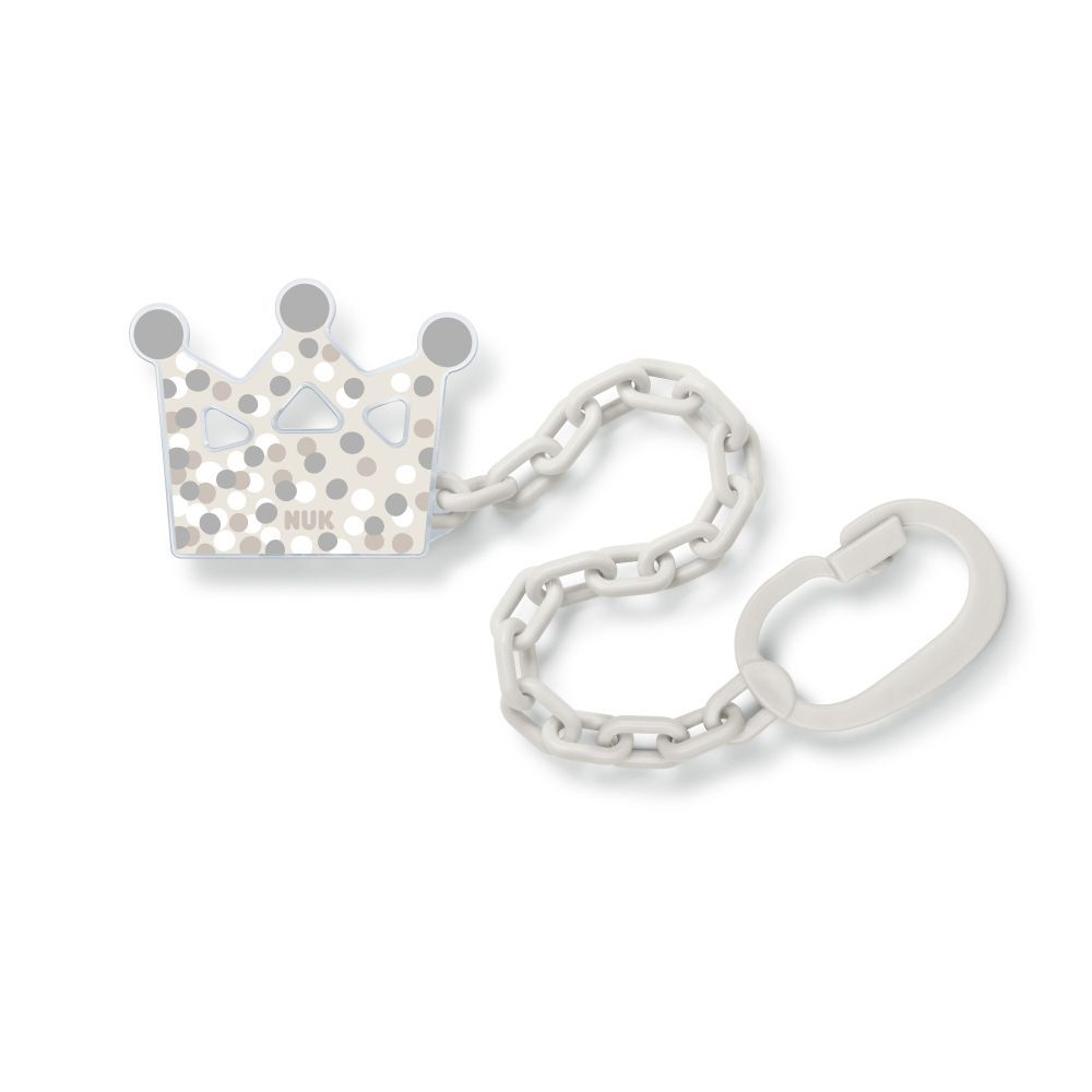 Suzetele sunt tare năstrușnice: cad pe jos, se rătăcesc sau se ascund atât de bine încât nu le mai poți găsi. Pentru a le păstra la locul lor, NUK a dezvoltat Lant Suzeta Nuk Coroana cu clips practic de prindere.