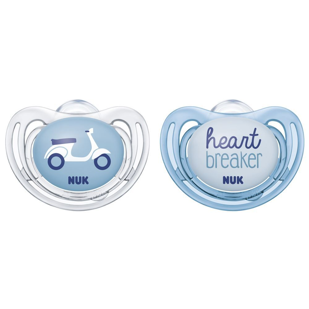 Nuk Suzeta Freestyle Silicon prezintă o tetină modelată după mamelonul mamei în timpul alăptării. Mulțumită acestei forme familiare, majoritatea bebelușilor, inclusiv cei alăptați la sân, acceptă suzeta. Mai mult, 92% din mamele care au participat la un studiu independent de piață au confirmat că tetinele NUK nu generează confuzie față de mamelon.