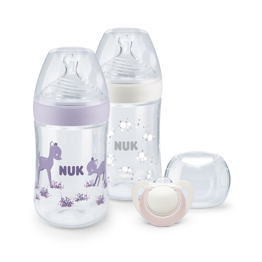 Bebelusul mult asteptat este in sfarsit aici! De acum, mama si copilul incep sa se cunoasca unul pe celalalt si sa se bucure de aventuri interesante impreuna. Mai presus de toate, hranirea bebelusului joaca un rol foarte important. Pentru ca bebelusul sa se bucure de o hranire cat mai naturala, NUK a creat biberonul NUK Nature Sense cu tetina similara cu mamelonul mamei. Setul NUK Nature Sense Start contine 2 biberoane cu tetina care ofera o senzatie naturala, o suzeta din silicon NUK Genius “My First Nuk”, precum si un capac pentru suzeta. Cu acest set, nimic nu va mai sta in cale. Acum, tu si bebelusul tau sunteti pregatiti pentru un inceput relaxant in noua viata.