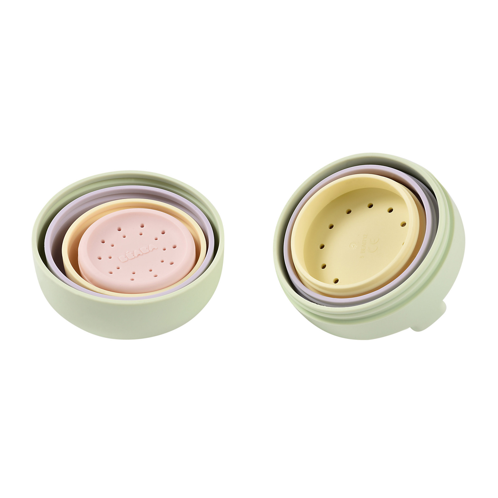 Fiecare element din Set 4 jucarii de baie Beaba din silicon are un maner ergonomic, adaptat mainilor mici, si diverse orificii pentru turnarea si stropirea apei, oferind multiple variante de joaca senzoriala. Piesele pot fi stivuite si se potrivesc una in cealalta pentru depozitare compacta, facilitand uscarea rapida si prevenind aparitia mucegaiului.