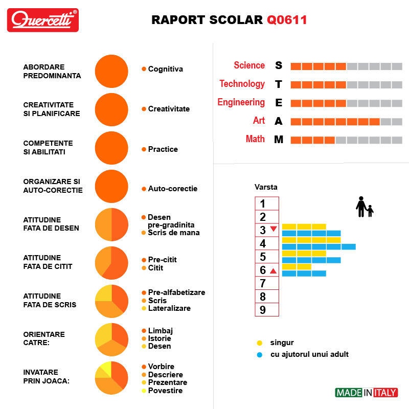 60 de ani de experienta Quercetti. Toate jucariile Quercetti sunt facute pentru a stimula creativitatea si intuitia copiilor prin joaca. Creativitatea este un element esential pentru a spori dezvoltarea sanatoasa, iar prin jucariile Quercetti, copiii dezvolta noi abilitati fizice si mentale si de asemenea invata sa rezolve probleme. Cu Quercetti, copiii se joaca inteligent!