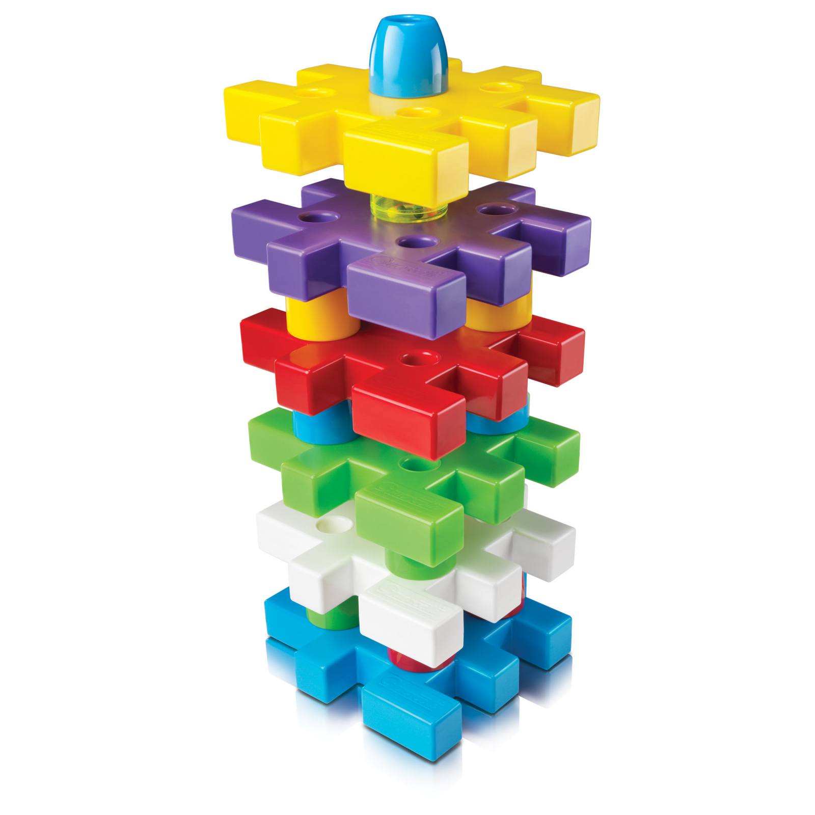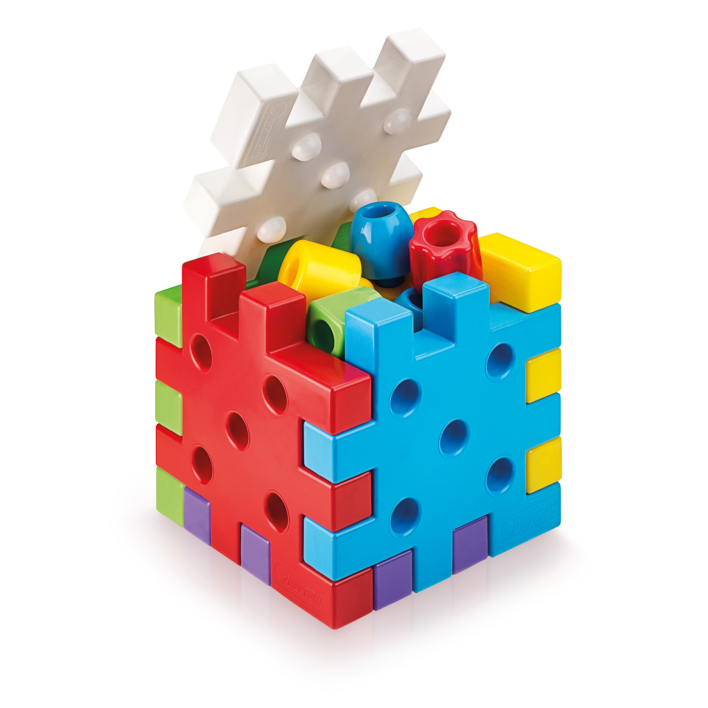 Placile mari si piesele rotunde, din plastic moale si rezistent se imbina intre ele cu usurinta, astfel ca bebelusul poate construi cu ajutorul lor diverse structuri precum coloane sau cuburi, in functie de imaginatia celui mic. Gratie materialului plastic de cea mai buna calitate (non-toxic) si a formei perfecte cu colturi rotunjite, copiii pot realiza din piesele jocului Qubò turnuri inalte, care stau intr-un echilibru perfect. Jocul format din piese cu forme diferite si colorate in culorile primare si secundare au rol educativ, stimuland perceptia vizuala, coordonarea ochi-mana si dezvoltarea dexteritatii manuale.
