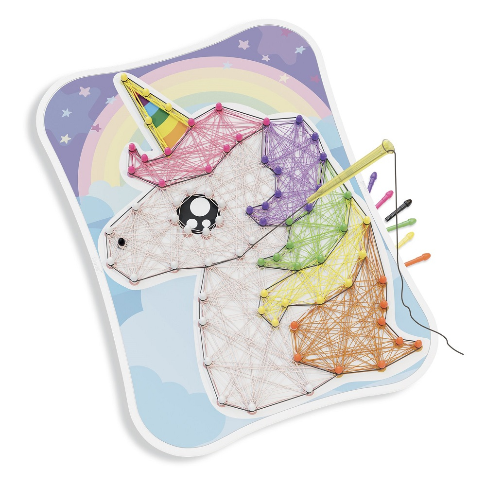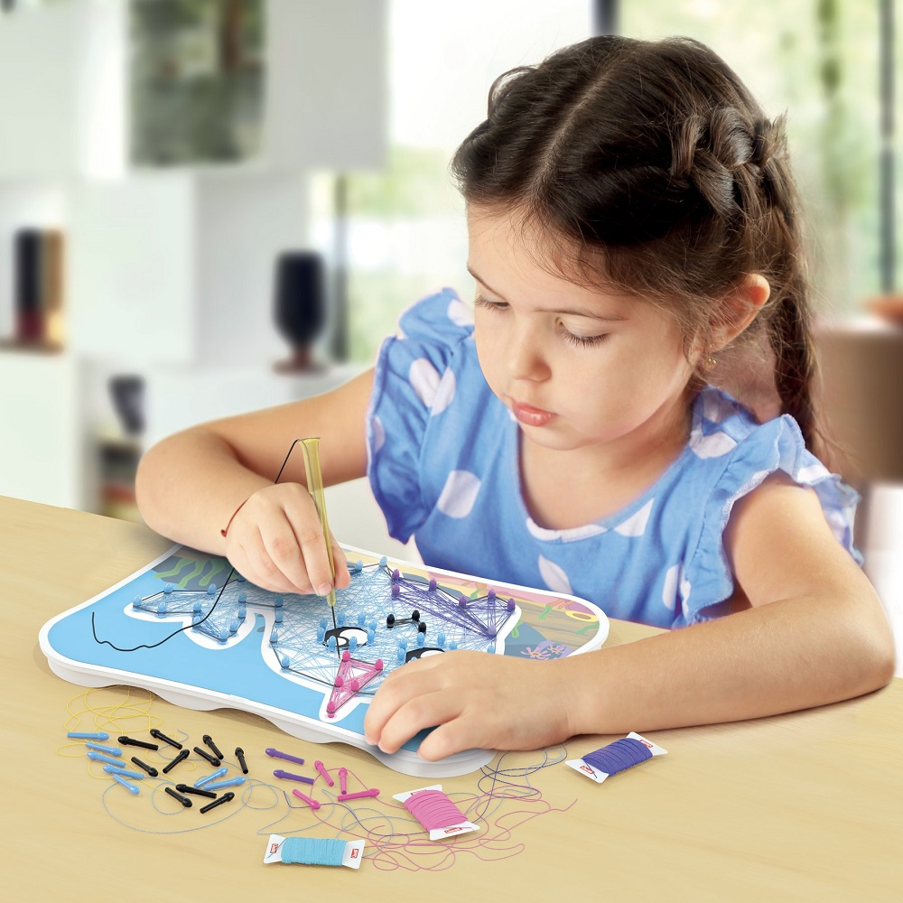 Tot ce trebuie sa faci este sa asezi o plansa cu model pe tabla perforata, sa introduci piesele tip Peg in locul potrivit si sa conduci firele colorate de la o piesa tip Peg la alta, cu ajutorul paiului ce ghideaza firul de ata. Astfel, creezi in mod magic adevarate opere de arta!
